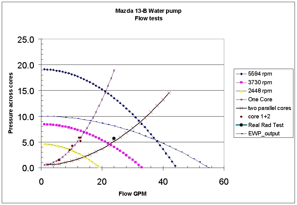 My interpretation of the data is that the flow (through the engine) will be less than with the mechanically driven pump if the mechanical pump is being turned more than ~4000 rpm. Bear in mind that the Mazda pump curves are AFTER going through the engine, and the EWP pump curves are with NO pressure drop through the engine.