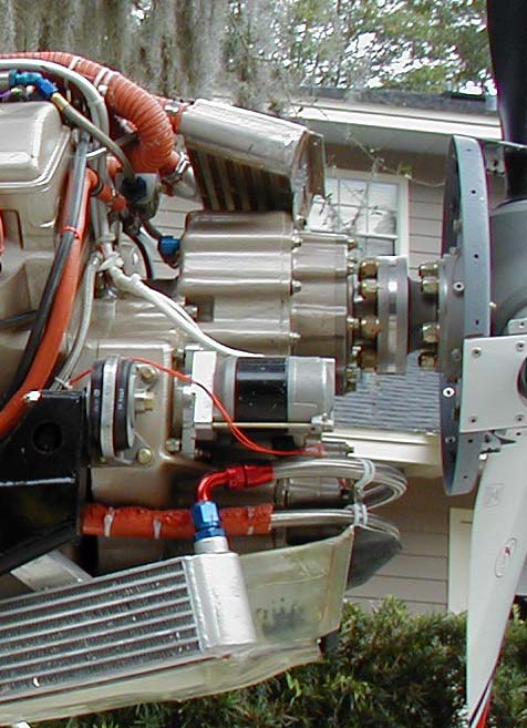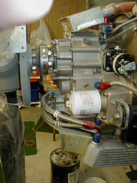 First of all, this is the gearbox on the 540ci V8 I've been working on (forever... 8-( )... I haven't a clue who made the gearbox itself, but it uses helicopter technology, has a prime number of teeth on all gears, no mesh less than 2 teeth at any time, etc. It's a big honker, has to weigh 100#. The pic of the left side shows the oil filter and just above it you'll notice a little circle... that's a sight glass. The oil level is to the middle of that glass. The oil line just to the right of it is the return from the cooler. The line coming out from just below the filter is the pressure line to the cooler. There is no oil reservoir, pe se, but the cooler and its hoses hold about another quart beyond what it takes to fill the box. The part sticking out in front of the filter (you can see it just aft of the hoses that wrap around the front) is the pump section. (I originally thought that the gears were splash lubricated, but that's not the case and is another reason it has an oil pump (along with feeding the governor.) You can see the McCauley governor kind of at the rear, in line with the prop shaft. If you look at the pic of the right side you'll see the starter... it's just a teeny thing but does a great job. The only reason I mentioned all this was because you were talking about building a box with c/s capability and this one has it, so I thought you'd be interested.