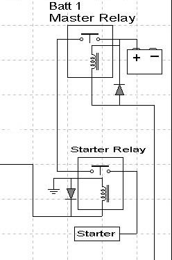 The diodes you want to put across the coils of all your contactors to protect the switches that control them are readily available at Radio Shack. You can buy a package with 10 of them for about $2. Look for a 1N4001 or 4002, or 4003... either one will work. I've attached a clip from the schematic that shows the battery master and starter solenoids... the battery master is switched on the ground side, the starter on the hot side. The schematic shows the diode placement for both circuits so you'll be covered for whichever way you've set up your starter switch. HTH.
