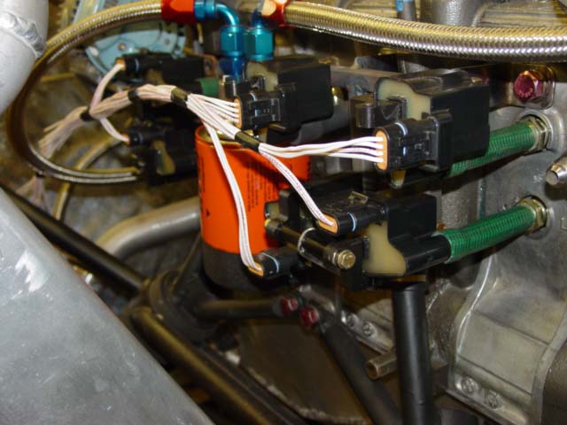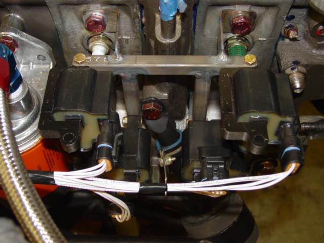 Here's three pictures of my coils-on-plugs setup, unpainted. (Lest anyone get the idea of using garden hose for plug-coil connectors, they were for mockup purposes only.) The brackets mount to the holes in the rotor housings that are normally used for knock sensors. I understand these bolt holes are only on some of the 3rd gen engines. So, you would have to find somewhere else to bolt to. The bracket is made of 1/2" square 4130 tube. The "wires" going from the coil to the plug cap were made from springs which I stretched out a bit. Since these coils are made to mount directly on the valve covers of the LS1, I didn't see any reason not to mount them where I did. However, if I start experiencing coil failures, I will most likely move them, or mount them on the plugs using shock mounts. -- Mark S.