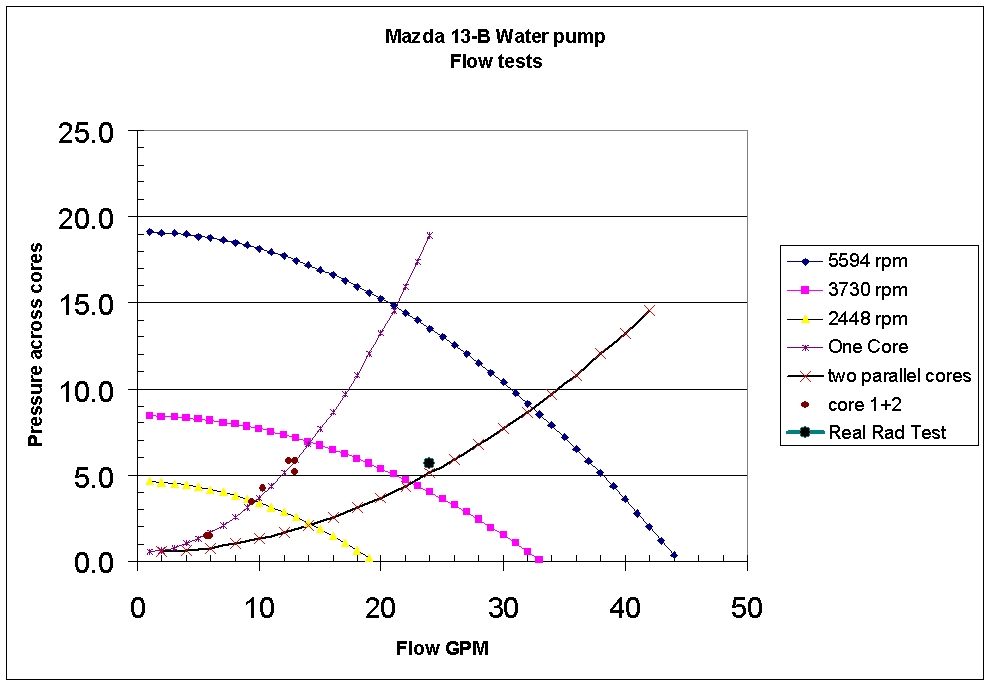 Attached is a plot of measured flow vs pressure data for the Mazda water pump, and for A/C cores used as radiators. I have published this before, but some salient points.