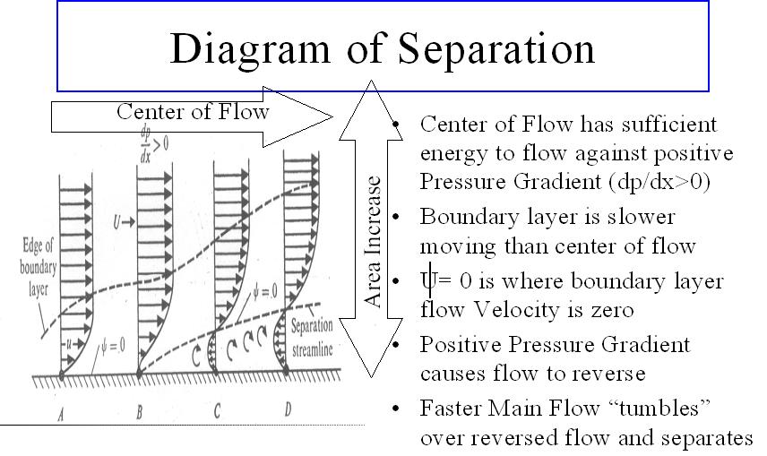 This slide shows a diagram of the boundary layer in the duct and the pressure gradient opposing it leading eventually to separation and turbulence and general lowering of cooling capability.