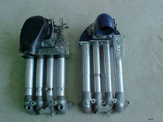 Here is a photo of two versions side by side. The one on the left was the first and used the stock 3 port Rx-7 Throttle body and worked fine, but it was heavy at around 26 lbs. The one on the right is the current version with the cast polyurethane plastic throttle body mount and a Mustang 65mm TB. It has some excess material removed from the casting and weighs around 12 lbs. Keep in mind I have a "Plugs Up" installation which gives me more space under the cowl to play with induction systems than many.