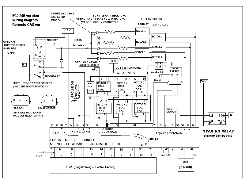 Here is what is certain so far. There needs to be an isolation diode in series with EACH of the 6 injectors, not just the two power feeds to the primary and secondary banks. There are more important reasons than the power isolation issue that Joe mentioned. In addition to these diodes, there should be a diode (regular, not schottky) from the junction of the secondary injector power feeds to ground. I am also changing the spec on the 20B staging relay to a solid state type. Attached is the preliminary schematic for this configuration but it is still under study until I can verify everything on my engine. This is the Renesis crank sensor version of 20B controller but the same changes apply to the standard crank sensor as well.
