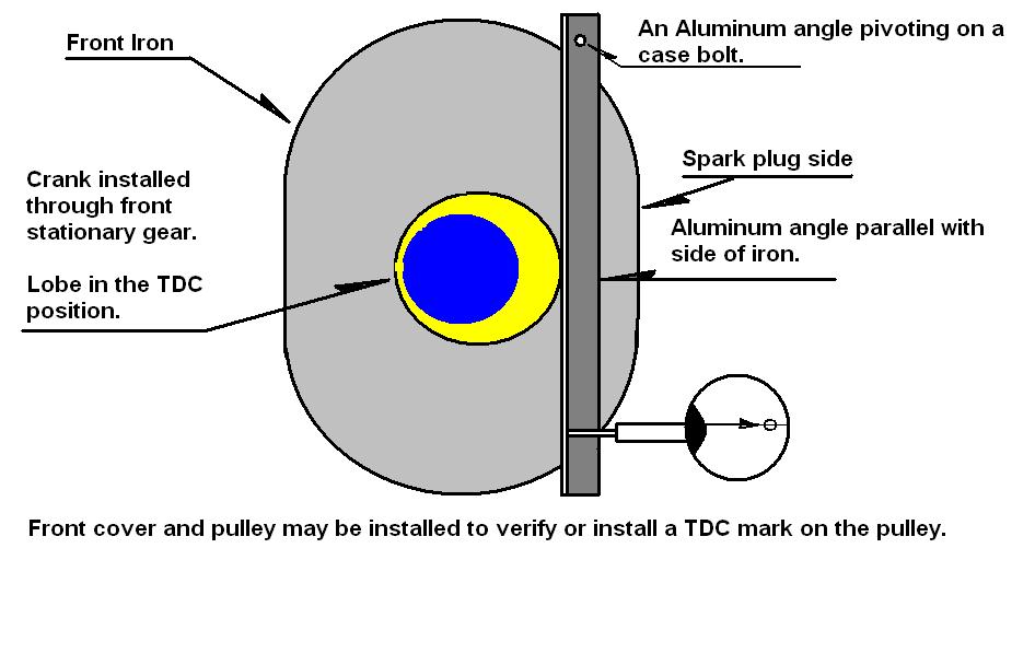 In this picture you can rig this up from junk parts and mount a degree wheel on the crank nut with a temporary pointer, or mount one on the face of you crank pulley with a wire pointer. In any case, this rig will get you inside of one degree accuracy , and that is more than accurate enough to set timing with a timing light. Mount the front cover you plan to use to see if the stock pointer will work for you. When looking at the pointer it should appear to be centered on the crank.