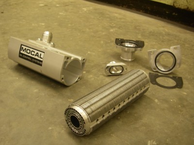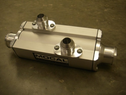 Quite some while back Mark Sietle put a Mocal oil cooler in his plane, which I was quite impressed with. Recently I began watching ebay for one of these coolers and a few weeks ago I hit paydirt. IRC, Mark was using the C43-330 which is a fine looking piece of craftsmanship but are pricey little devils at $350 apiece. They are 330 mm long and a single pass. The E54 series offer 25% greater cooling in a comparable size, while the ECD54 series are dual core and have double the cooling capacity as the comparable size C43 cooler, but are prohibitively expensive at ~$800.