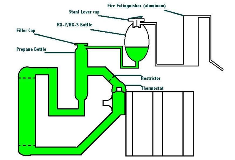 It is very difficult to remove the air from the rotary engine, and I have the engines out of the car every two or three weekends, so it turned into a giant pain with each refilling of the coolant system. The inlet flow is in the center and on a tangent so as to spin the coolant. Any air pops to the top of the can and as pressure goes up with temperature the air is forced into the bottom of the make up tank. When coolant temps drop a bit the pressure in the make up tank can force only coolant back into the system, no air. After only one heat cycle you will need to add coolant to the make up tank. The overflow tank is required for racing, but never gets any coolant in it.