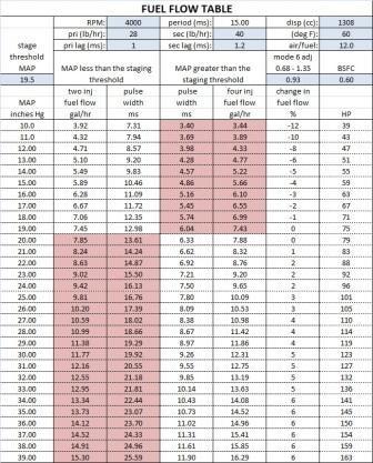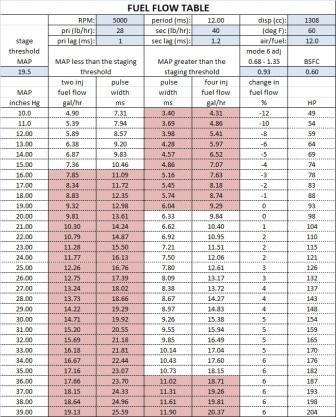 I've attached a couple of poor quality images of a spreadsheet that I made. It calculates fuel system parameters from basic principles assuming a volumetric efficiency of 1 throughout. The blue cells are data that can be input and I've entered the best data I have for your system taken from your posts. The red cells are conditions that are not attainable due to either the staging threshold setting or pulse width limitations. The conditions for both tables are the same except for RPM. The 5000 RPM table shows what can happen if the primary injectors are too small for the staging threshold chosen. There is an intermediate region where the fuel flow required is more than the primaries can deliver at 5000 RPM although everything was fine at (arbitrarily chosen) 4000 RPM. It might be possible that tuning on the ground is alright, but when the RPM builds up in flight, the small primaries become a problem. I don't know if this is what is happening in your case, but it might be something to consider. If this were happening, fully opening the throttle in flight could result in operation within the attainable parameters again but above the staging threshold.