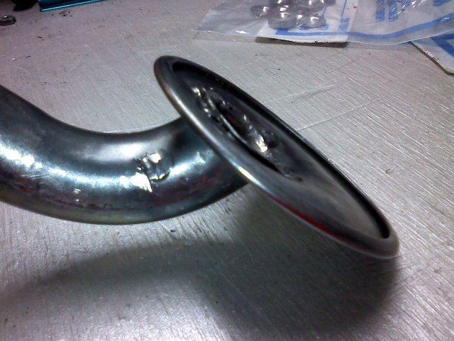 While I had it apart, I modified the oil pickup tube. I pull the screen off, and cut the welds on it's mount plate with a dremel cut-off wheel. Then I fluted the end by pushing it up against a ball hammer and tapping around the the edges with another. The I slid the plate to the end and tack welded it solid. A little more tapping on the ball to give the plate some roundness.