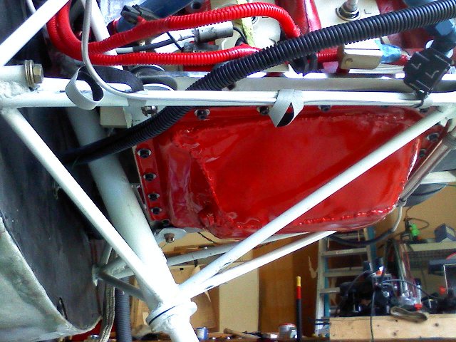 I pulled the oil pan back off to do a little surgery to it. The oil plug is at a much better place now. With the cowl on, I should have no problem reaching in to pull the plug and drain the oil, even after I put the muffler back on.