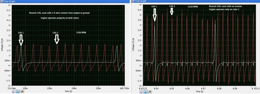 signals. One thing of note may be that the Renesis 1 tooth signal crosses zero between triggers whereas the 2 tooth '86 signal remains above zero between triggers. There is no discernable change in the Renesis CAS signals when the transition