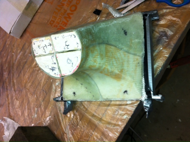 Reassembled duct in rough trim, sitting on the oil cooler. Next step: glassing transitions so it can be attached to the cooler. I'm really impressed by you masochists who manage to build an entire airplane out of this stuff.