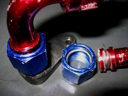 I now have some experience with their AN10 PTFE hose and fittings as shown in the attached photo.  The fitting is manufactured by placing the blue nut on the red fitting and inserting the heavy wire through the hole in the nut.  The wire captures the nut and allows it to rotate relative to the fitting.  When the tapered part of the fitting first contacts the male end to which it is being connected, the fitting cocks sideways in the nut as seen in the left side of the photo.  If the nut is tightened further, the fitting rotates with the nut and thus maintaining proper alignment of the angled fitting is nearly impossible.  If the fitting is restrained from rotating, the wire inside the nut digs into the fitting and then comes out of the back of the nut with the results as seen in the right side of the photo.  I have used fittings of similar design from other vendors successfully.  Apparently the dimensions of the wire or the grooves in the siliconeintakes nut and/or fitting are not correct, or the aluminum alloy used is too soft, or there may be some other defect.  I tried installing two 90 degree fittings and two 45 degree fittings and all of them failed.
