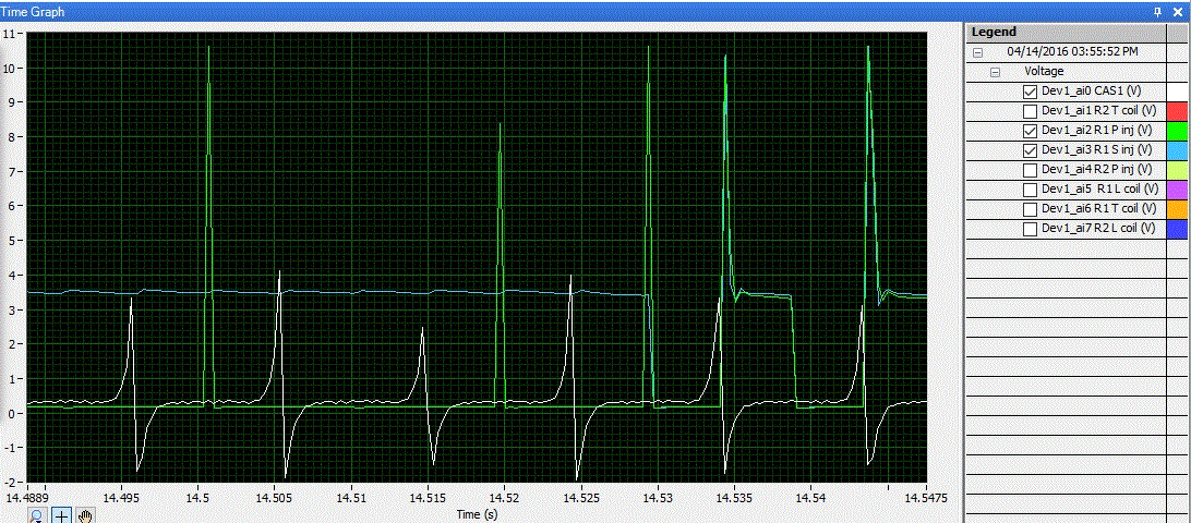The attached plot is of EC2 primary and secondary injector and CAS signals for 13B (not Renisis CAS) showing the primary injector sometimes at max pulse width and sometimes saturated and then at the right beginning to use both the primary and secondary injectors when