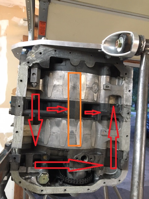 I’m fabricating a plugs up oil pan and block off plate for my spare Renesis and new turbo FWF. I’m using Ed’s pictures as a general guide for fabrication. I’m a little concerned about the oil drain back path and volume. The path from the center iron and rear iron \ regulator would make most of the oil flow toward the front iron and down past the oil pump as the bottom of the rotor housings and center iron are flush with the block off plate. I will incorporate a recess in the block off plate to provide a more direct drain path over the rotor housings and center iron humps. The block off plate to external oil tank drain has (7) 7/8” holes. I’m hoping that’s enough to keep oil from backing up into the oil pump chain and engine cavity. I am considering using an external oil pressure regulator installed at a remote oil filter with bypassed oil feeding directly back to the tank. I know the 13B oil pumps flow about 15-16 gpm but I have not located any information regarding how much is bypassed by the regulator. Any ideas?