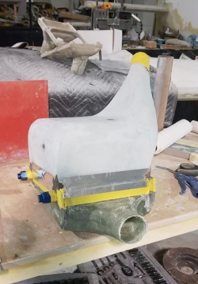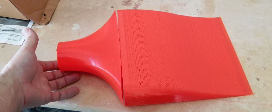 To create a Kays & London wedge shape for the inlet, I could of used a flat stock and called it a day. But really it's an 'S' shape to maximize equal amount of air to flow across the rad. Plus I had to make the wedge shape, turn into an 2.75" pipe opening for the scat hose. I wanted to keep the bends like a trumpet, to maximize the air sticking and following the sides without disturbance. Could of sanded and shaped the pieces out of foam for days and days.. Or punch them into autocad. 3D print the parts, then fiberglass overtop of the molds.