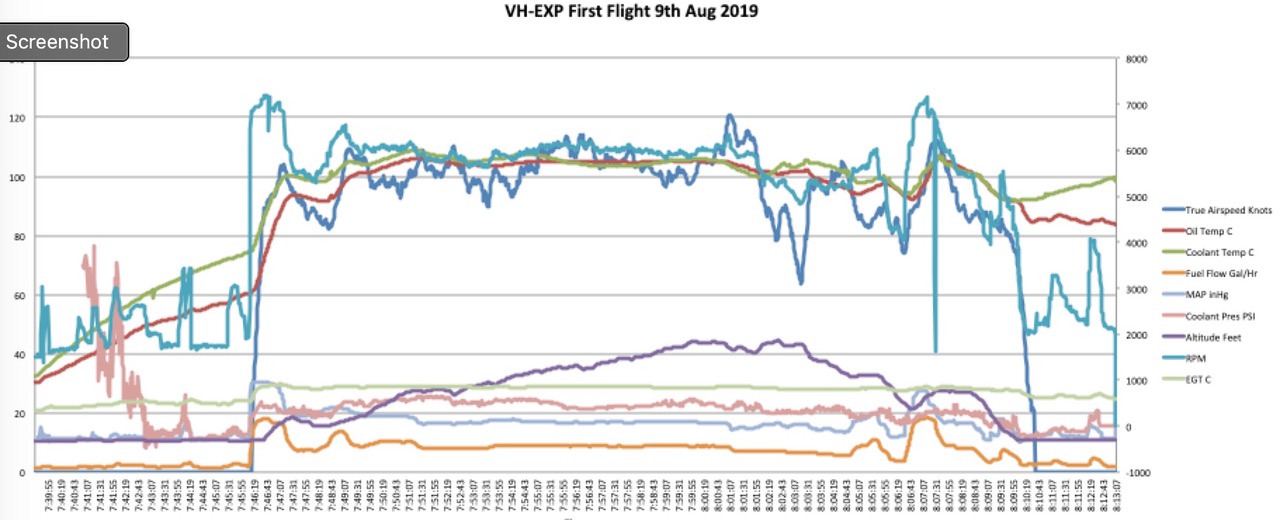The Glasair has finally left the ground and had a successful first flight. I’ve attached a graph of the data. OAT was 63F I was really very pleased given our smallish 20in2 coolant inlet area and <9in2 oil inlet area for ~190hp. The temps are a bit hot (~220F) but we didn’t go beyond 110 knots. I suspect when we get the airspeed up above 150knots into her nose we’ll see some improvement. My hunch is we might have too much pressure in the cowl. The exit air area is approx. 30in2.