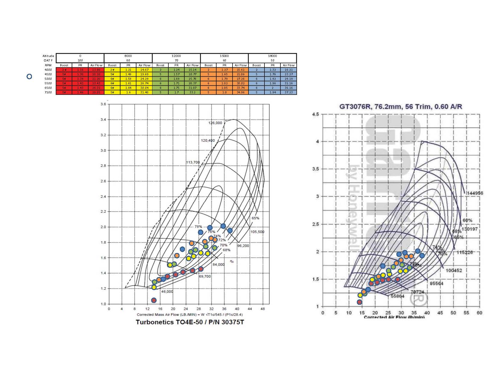 I’ll muddy the water a little. This is a scatter plots for a TO-4E-50 and a GT3076R 56 trim. The plots shows extreme operating conditions at altitude. PR remained 2.0 or lower. I purchased the GT 3076R with a Tial 1.06 housing for the RV10. I’m a little bummed I can’t use it for the Rans S21 even for a muffler. FWF weight limit is 350# and I’m hoping to use a constant speed prop. Bobby From: Rotary motors in aircraft [mailto:flyrotary@lancaironline.net] Sent: Tuesday, August 04, 2020 2:58 PM To: Rotary motors in aircraft Subject: [FlyRotary] Re: Turbos for 13b's in aircraft In that spreadsheet there is a stack of turbine maps laid on top of each other. you can right click, stack, "send to back" to see some of the other maps. I was told that the T3-50Trim was very close to the stock Hitachi. Good average numbers for our use would be a P/R of 2.0 to 2.5 and a "mass" flow (at sea level) of about 30 lbs/min. The best compressors seem to be the TO4 - with trim of 40-60. The TO4 E50 seems about perfect. You can send your old core to BNR Supercars. For about $1 AMU (Aviation Monetary Unit) they will bore out the turbine housing and install a TO4 turbine wheel (ask for an aggressive trim/clip). They enlarge the wastegate hole and install a 360 degree bearing, install the compressor of your choice and matching new compressor housing. Also, you can upgrade the wastegate actuator if you want. There will be almost nothing left of your core except the turbine housing that fits into the stock location. Its an excellent solution I highly recommend. They may try to talk you into a smaller turbo, but only because they dont understand high altitude applications. Also, we don't care about spool up time. Check our their website, BNRsupercars Thanks for sharing that spreadsheet Dave. It has been an educational tool. When I first built and got this stock turbo, I did buy a couple of recommended books on turbocharging, but due to a shortage of time and resources I really didn't pay them as much attention as I should've. Instead I just told myself that I wasn't going to be a Reno racer and I just wanted to use it to get off the ground quickly and to give me a little safety margin flying in mountain valleys. But with the abundance of good YouTube videos and tools such as this spreadsheet available today, it is pretty easy to see that even when I'm taking it easy, I'm still asking alot of this turbo. About 2 years ago, nearing the end of one short (40 minute) but fast speed run I did have a low sump oil alarm come on and I'd already noticed a lower than normal oil pressure. I landed at my home airport without issue. This was before I'd installed a orfice restriction in the turbo oil feed line. On an inspection the next day, I found a little excess play on the turbo shaft. I just chalked this up to normal wear and tear as the turbo had never been rebuilt, so I ordered a rebuild kit and oil usage and pressure have returned to normal. There are some things that I don't know about my turbo, such as the compressor wheel trim size so I'll have to take it apart to measure this. So I'm not certain exactly which compressor map I should be using. However, playing with this spreadsheet has shown that I'm clearly running in the "choke zone" regardless of which T3 map table I use. This is certainly not acceptable to continue on this path, so I'm beginning to dive a little deeper into this to find affordable options to improve this. Thanks Dave; I was expecting that you would've had something a little more purpose-built for the task, however the fact that you accomplished that with an industrial solenoid valve is interesting. It looks like they have a minimum size of 1/4" NPT, with a 1/8' port size. I have a few of these as we used to use these in an effluent sampling system but we have now changed to a different system so no longer use them. This is the same valve used by my TurboSmart electronic boost controller and are available cheap on Amazon. It is a 3-way valve but a pipe plug in port #1 will make it a 2-way NO valve. They are designed for air use, but are tolerant of lube service, and using it as a safety shut off valve, will subject it to almost zero cycles (other than test), so it won't see much wear. I did a google search. there was a company in FL that made valves to spec. I got a normally open, 12v, electric valve with oil tolerant innards and NPT fittings. cost about $120 at the time. Cant remember the name of the company.... Hi Dave; What did you use for a shut-off valve for your oil? Kelly, you are right. I even mentioned the TO4-E50 in my post above. Mark, its not about the horsepower so much as keeping the turbo in its proper operating environment for the conditions you are going to be giving. You mentioned "300-400hp" in your post, but it seem that perhaps you dont have a specific target in mind. Thats fine, but you are not going to land much above 180hp unless you have a specific target and a plan to achieve it. The stock hitachi you mention is a T3 turbine. It and the 2nd gen 13b it ran with were only rated at 200hp in the car - and only for short bursts. I did what you are thinking about doing. I ran the stock turbo to see what I would get. I was making a little over 200hp and the turbo lasted for about 70 flight hours. Looking at its turbo map, the impeller was running over 100k RPM. It's very surprising it lasted 70 hours. It probably only lasted that long because most of the time I was not running full power. The turbo imploded on my first long cross country. I was almost home and decided to let it loose a little. I was running about 30" MAP at 17.5k altitude. It lasted about 30 min doing that. My advice, if you want to experiment with turbos, is to install a shut-off valve on the oil feed line to the turbo. I now have one in my installation. When the turbo goes it will be hemorrhaging oil into the exhaust. Without a shut-off valve, you will run out of oil before you can get very far. With the 