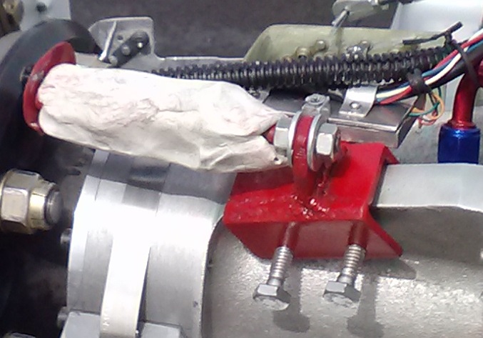 180 degrees from the trigger. The accelerometer is seen behind the red clamp and was installed in a 1/4” aluminum plate. This was screwed to a second 1/4” aluminum plate which was bonded to the redrive with epoxy putty. Before the engine was started, a