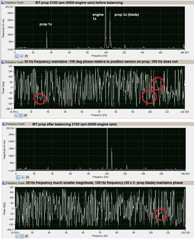 This photo shows the Signalexpress FFT processed data from balancing the prop on the ground. The prop 3X (blade) signal disappeared in flight.