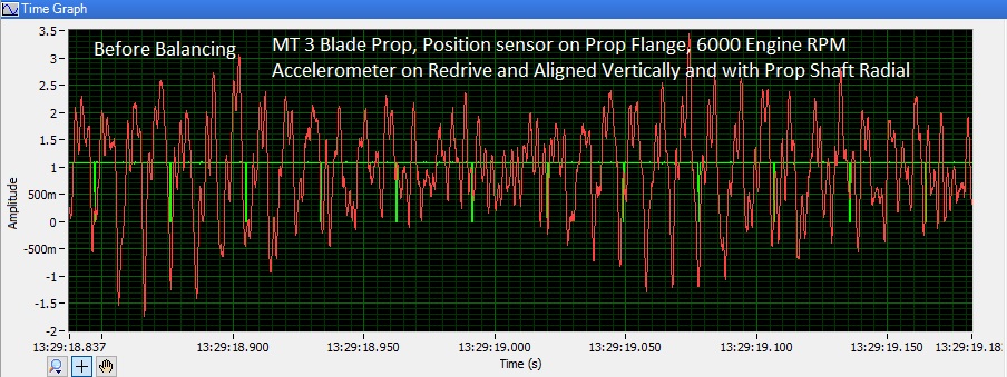 It should demonstrate the challenge involved in working with the raw data directly. The green trace is the position sensor signal with a transition at each prop revolution. I, for one, cannot see evidence of a one-per-prop-revolution vibration in the raw data. The beat with a frequency of about 7 prop revolutions is a result of the reduction drive 2.85 ratio, each blade of the 3 blade prop, and the fact that neither the engine nor the prop are perfectly balanced.