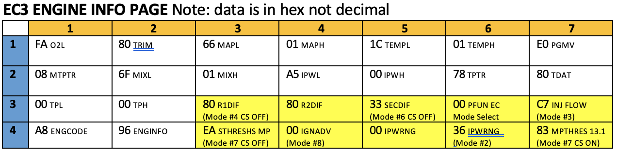Here is a table of the Engine Info Screen and displayed parameters in case its helpful to anyone. Notes: 1: Enter Engine Info Screen by - Holding Execute and pressing UP 2. The hex data is just my setup at that time. 3. Row 3 Column 6 displays the EC mode switch position. 4. Note the shaded cells which are key parameters for the various programable Tuning Modes. 5. ENGINFO field bits 0=TURBO,1=LGSEC,2=O2SenType,3=TEMPSENSOR,4=ROTARYEng/MAP Sensor,5=BUSENSOR,6=CONT,7=CSON
