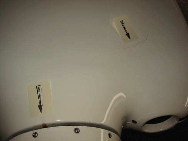 I am attaching a picture or two of my top cowling to illustrate a problem I have had with vibration/flexing and paint cracking. The ramps I installed to smooth out the flow of cooling air into the engine caused a hinging effect at the point where I bonded them to the upper cowling. The pressure inside the plenum caused the flexing that resulted in the cracking paint, indicated by the arrows. I have sanded and repainted and stiffened the interior with many more BIDS but the flexing continued and resulted in cracked paint again.