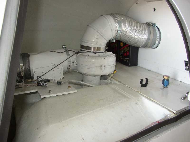 Evidently, my system is not all that heavy at 2162 lbs since the only aircraft I know of, that was lighter was Dave Saylor's at 2150 lbs. Also, the C.G. is right on. I have also included a photo of the baggage compartment blower that cools the condenser which is located under the floor of the baggage compartment. I hope to be able to delete this blower if the NACA scoop in the tail can