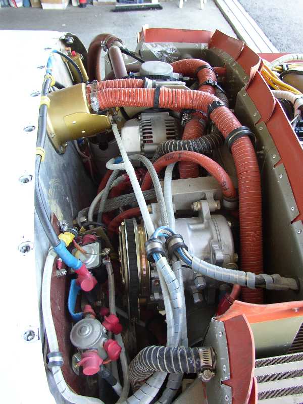 Attached is a photo of the A/C compressor on the rear of the TSIO 550E engine using the TCM bracket and idler pulley. Note that the battery had to be removed from the firewall and located in the baggage compartment.