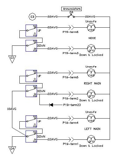 [I thought I'd pass along the schematic that depicts how we did the gear lights on Ted's airplane, see the attached JPG. You'll notice that there is a diode hooked into the Right Main gear down circuit... that feeds the signal required by the AOA to shut off the gear warning. Additionally, there seem to be differing opinions about whether the "gear unsafe" indicators should be yellow or red. From my POV it kind of depends on the current flight regime... during cruise, knowing that one of the gear isn't completely seated in its retracted position would probably only rate a yellow (caution, something's not quite right) light. But in the landing configuration that light is a definite (red light) warning that the gear is still somewhere between retracted and extended. We chose red because that issue in the landing mode is more important than when in cruise. We installed the main gear-up switches over those inverted-U-shaped cutouts in the gear box where the gear legs start their bend. The nose gear up switch is mounted to the inside of the stainless heat shield box that separates the engine compartment from the tunnel. The P19... legends indicate the plug that interfaces this circuitry to the Aerotronics-built panel. I hope this helps.
