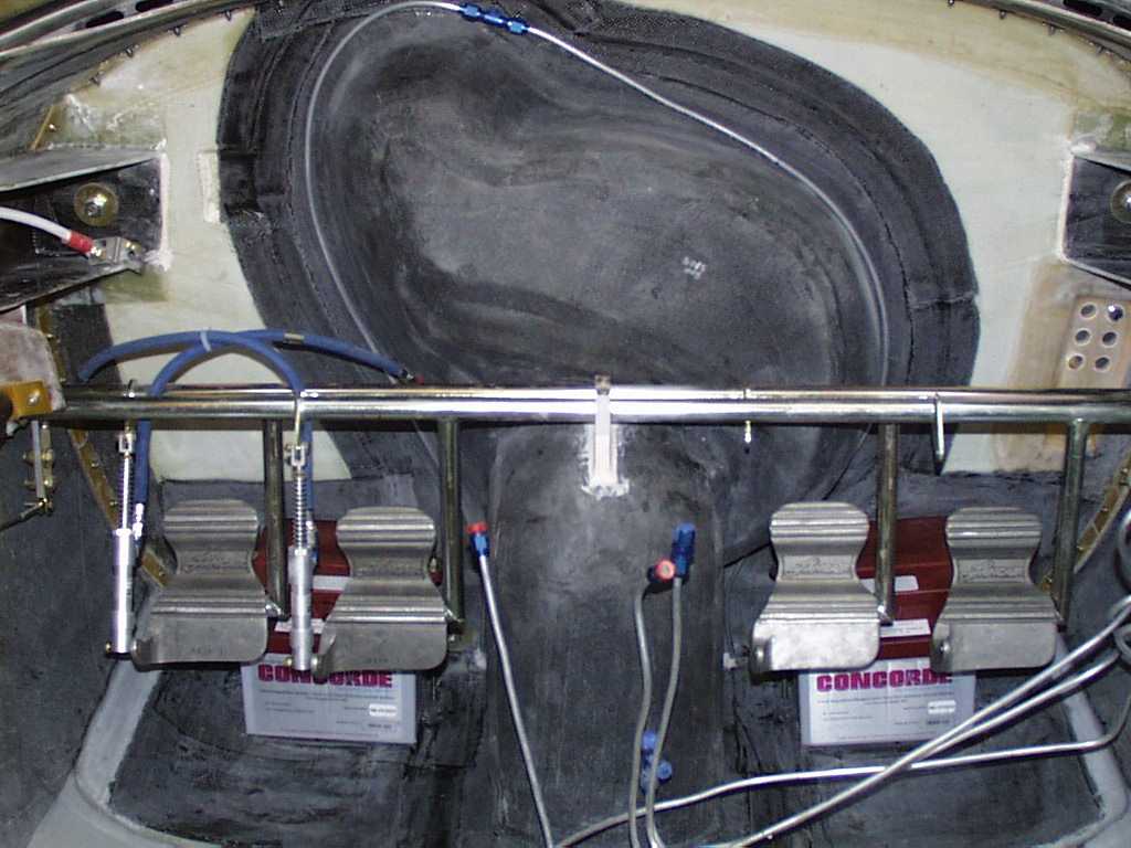 My rudder peddles are as far forward as the firewall pocket will allow. The Batteries are Concorde RG-24-15M. About 6" deep and 7" high and wide. Because of the pocket, the batteries slide in and out under the rudder peddle that lifts out of the way. May not be able to use a box. Pictures are included.