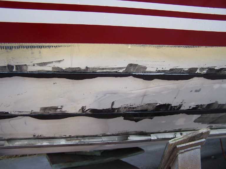 If you look at the hull below the waterline, you can see three aluminum battens 12' x 3/4" x 3/4" that have been screwed into the hull (only because the angle of the plane changes twisting the batten, otherwise the ropes would be adequate). The battens were first used to plot the the highs and lows and the highs taken down with a long board sanding block, in this case 33" long Velrco backed long boards. Then she was ready for battens since all that was left after long board sanding was low spots. The ropes which are often all you need, were slung around and tightened very snug around the fair part of the hull. The battens were then waxed and placed under the ropes, and once a good fair line was extablished, screwed at the ends. The lows were all that was left under the battens, and there only 4-6 feet needed fairing. Since by definition, these battens form fair curves, and the gaps underneath lows, all you have to do is pack a bunch of putty underneath it and once hard, remove the batten and what is left is a fair curve in putty. The top photo shows a detail of the putty bead left under the batten after the batten is removed. I also like to add some pigment to the putty so that I have a contrasting color when I'm sanding and know what my reference point is.