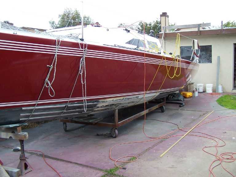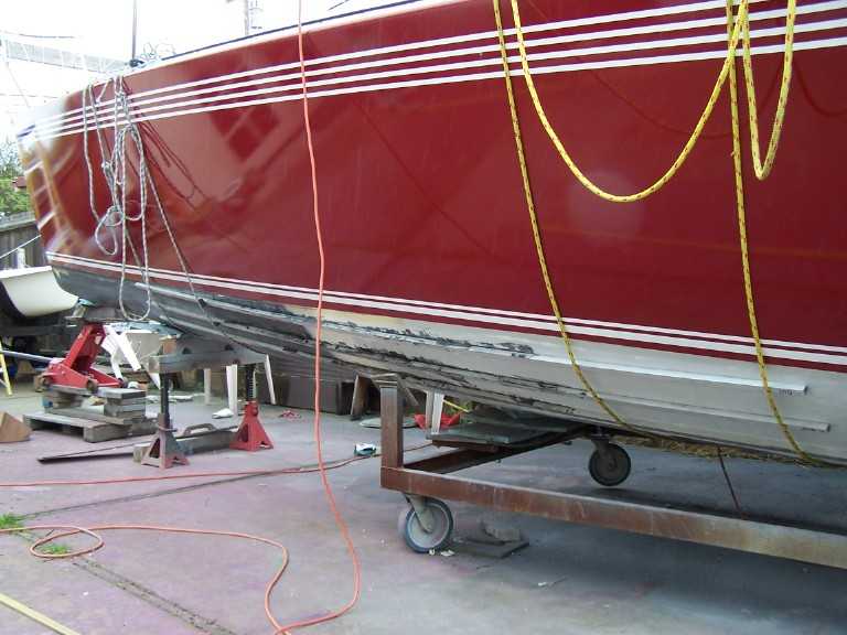 To repair the bow, I cut off the front 13', splashed a mold then scarfed in a new bow. So that's about 1/3 of the boat's overall length of 37'. The photo's show fairing on the last of the splice below the waterline where I attached the new bow to the boat. The topsides have obviously been completed and were faired using the same technique. In fact when I first built the boat is when I developed this technique. It saved a LOT of time!