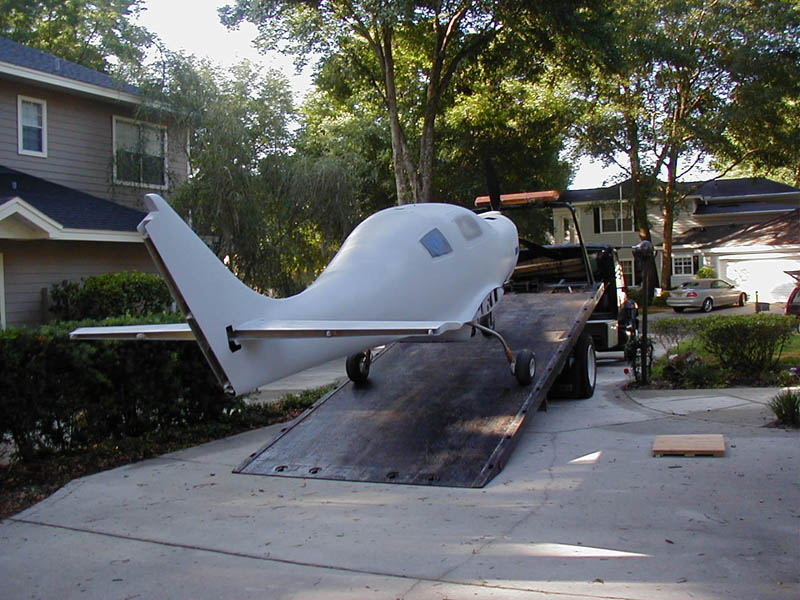 After 7+ years of gestation in Ted's workshop, Ted's IVP experienced its first climb to what was to be a cruising altitude of 3'-9" AGL, atop the back of a tilt-bed on its maiden voyage to Delta-Echo-Delta, the DeLand Municipal Airport in sunny Deland, Volusia county, Florida. A picture of this first leap to the heavens is included for your enjoyment <g>.
