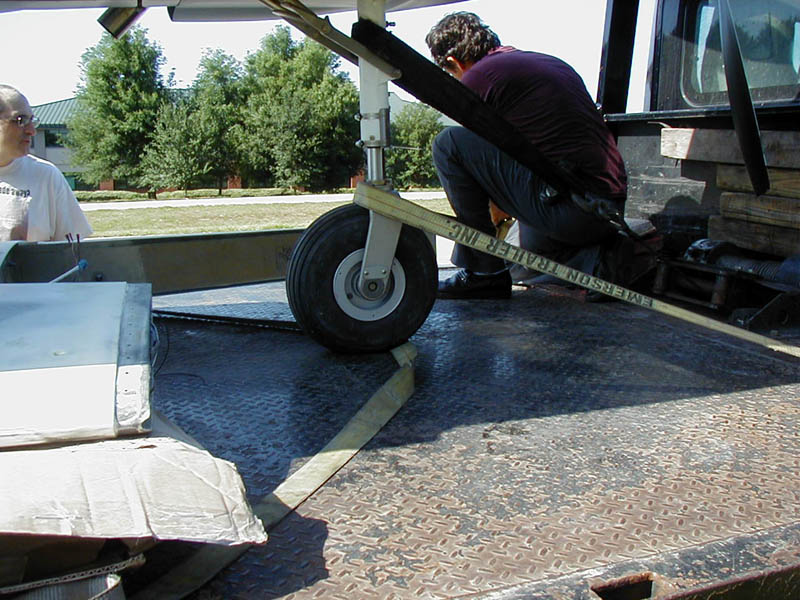 I've been involved in the movement of many different types and sizes of machinery and equipment over the years, and learned long ago that it is always prudent to make one final check of the load after the first mile or so, before getting onto the expressway... just to be sure that everything is as it should be after it's been jiggled for a bit. We pulled over at the entrance to the ramp to give the load a once-over and found that the straps on the nose-wheel had actually caused it to turn and, as a result, they were no longer providing their desired tension. We repositioned the straps, re-tightened the binders and hit the road. Pic attached.