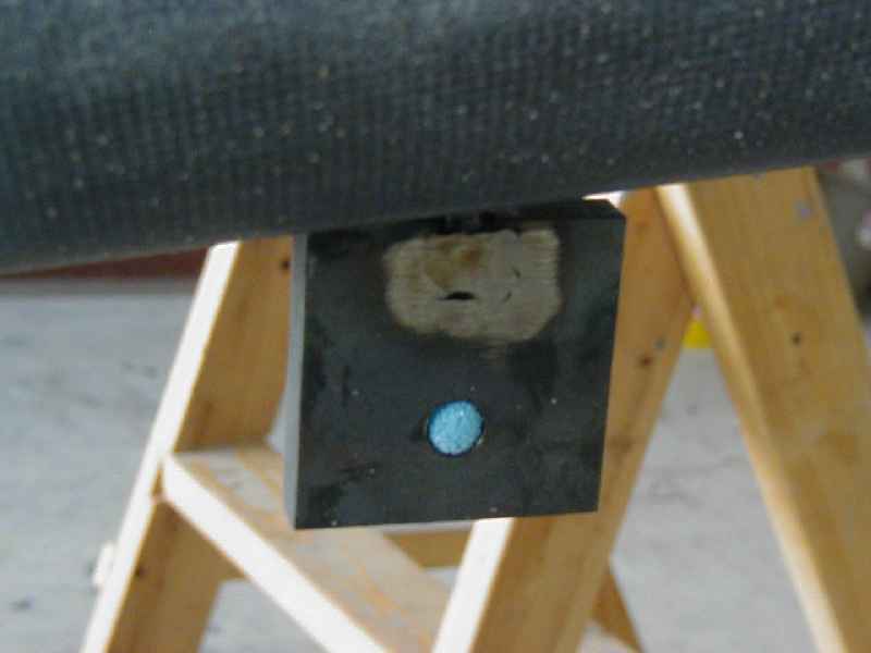 """ [We added a single ventral fin to Ted Noel's IVP... moved the tie down receptacle into the upper edge of the fin. Attached photos show the submerged fitting and its location inside the fin. The blue foam in photo 17 was used to protect the threaded area during the layup process... the fitting was made from a block of 3/8" thick steel (to match the 3/8" foam core in the fin) welded to a threaded rod that matched the threads in the original tie-down receptacle. The original tie-down eye simply threads into that fitting from the side. <Marv> ]