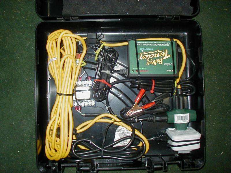Ted - Pictures available? Schematic Available? If so I would appreciate getting copies. Or, perhaps Marv could post them on the website. Thanks, John Schroeder [Here's what it looks like. Pretty simple setup, all components are attached to the interior of the case with wire ties. I left the original connectors intact so we could hook the unit up to another battery by simply plugging in the alligator clips. <marv>