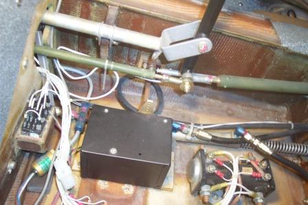 The servo is mounted under the passenger seat and the only compromise I had to make was the construction of a simple output shaft extension to position an output lever (control horn) to allow a straight line connection to the idler. The shaft extension is made of a piece of steel tubing with the horn welded to it, slipped over the end of the servo output shaft and secured with a safetied roll-pin. The outer end is captured in a bearing attached to the aft side of the main spar web.