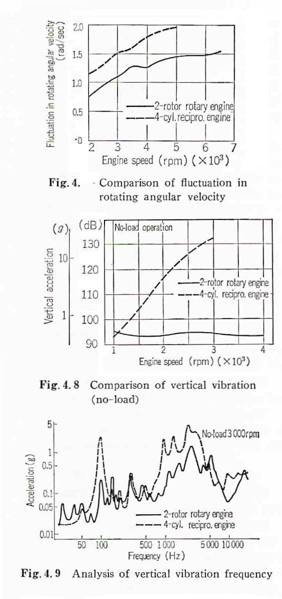 I'm sure you've heard of the smoothness of the rotary engine. I've enclosed two charts which compare vibrations of the 2-rotor wankel to a 4-cylinder reciprocating piston engine. The difference is very apparent.