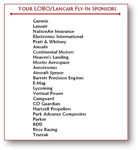 Fall is here, bringing with it fantastic flying weather. This year, fall brings even more excitement for LOBO members and Lancair owners; the time is almost here for our get together in Branson! We want to take a moment of your time and remind you to thank our sponsors whose generous support has made this event possible. Most importantly, we want our sponsors to support us again next year, and the best way to make that happen is to ensure they have a positive experience this year.