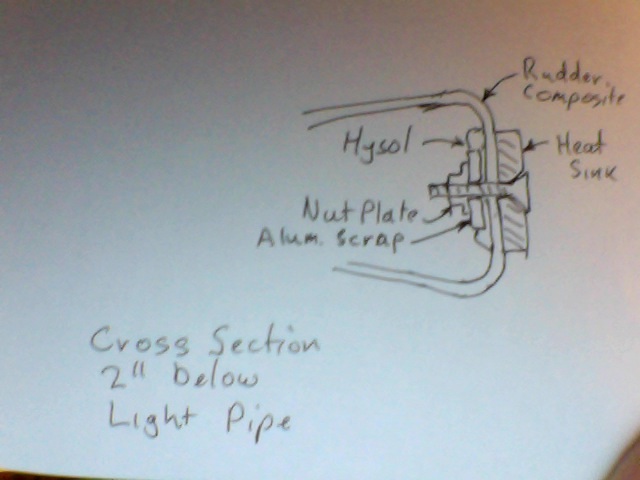 that in place with hysol, inside the rudder, as a mount for the heat sink. Had to thread the nut-plate-carrier thorugh the 1 inch hole I made for the LED. Sketches attached.