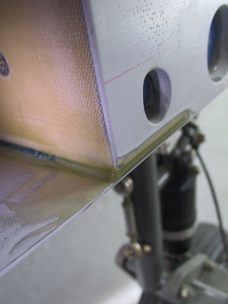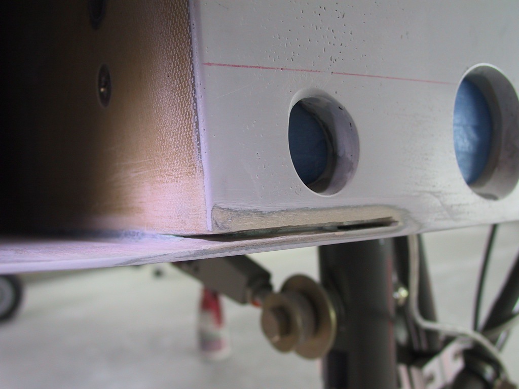 While masking and prepping the fuselage for paint today, inspection of the left stub wing revealed a crack in the bond of the lower wing skin at the stub wing rib/main spar/D section area. The lower skin was bonded with Hysol at the factory, there are multiple BID layups on all joints within the gear well itself. I can only imagine that with a handful of wing install/removal cycles during construction, that pressure from the outer wing main spar on the stub wing skin during installation could have caused this.
