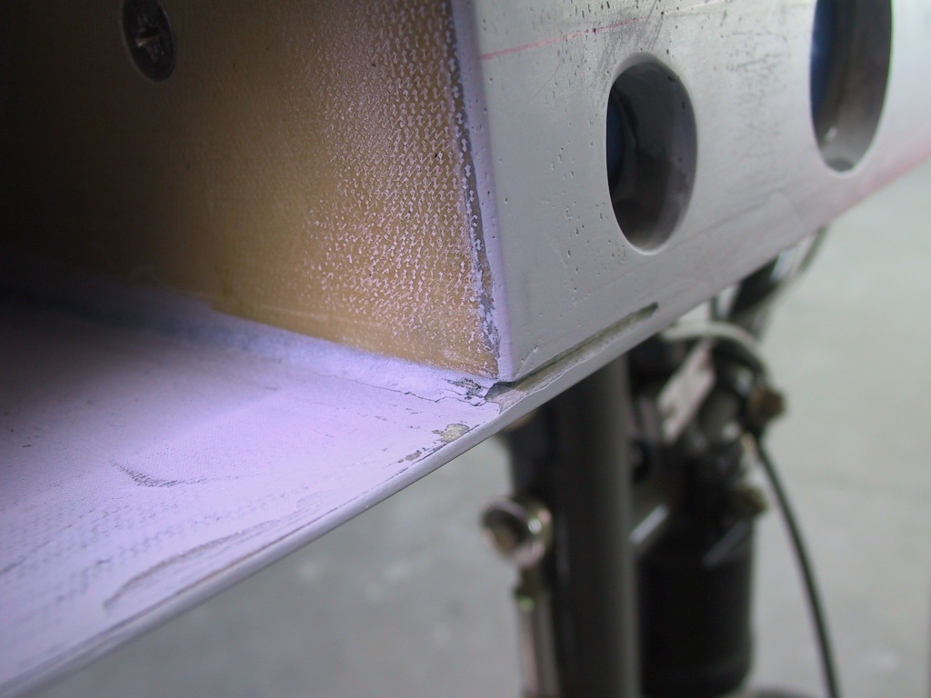 While masking and prepping the fuselage for paint today, inspection of the left stub wing revealed a crack in the bond of the lower wing skin at the stub wing rib/main spar/D section area. The lower skin was bonded with Hysol at the factory, there are multiple BID layups on all joints within the gear well itself. I can only imagine that with a handful of wing install/removal cycles during construction, that pressure from the outer wing main spar on the stub wing skin during installation could have caused this.