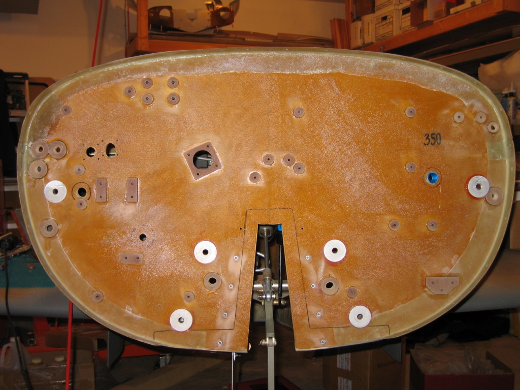 With either approach, you need to make sure there is no crushable material under the engine mount. I extended this concept to *every* firewall penetration but it is not critical except at the engine mounts. Usually I glued a piece of phenolic to the plywood bulkhead equal to the thickness of the blanket. Under the engine mount I used the area washers. Under the nose gear “doghouse” I used metal sleeves from Ace Hardware. All fasteners except for the engine mount bolts go into Click-Bond nutplates on the aft side. The blanket is tacked into place with red RTV, is actually held into place by everything bolted onto it, and sealed around the outer edge with red RTV.