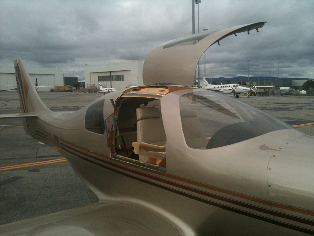 This was Frank Fry's Lancair IVPT until about 18 months ago. The new owner has been flying very high with a high pressurisation differential. On this occasion he had a bladder tank on the back seat and was flying from Perth direct to Hobart over a lot of water at FL250 when the right window blew out. He diverted to Adelaide where this photo was taken.