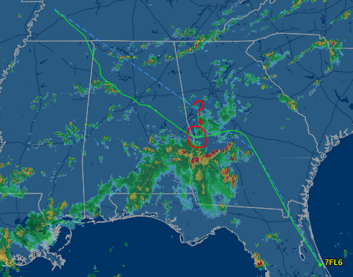 I queried Atlanta center and Atlanta approach. At the point I marked on the attachment, I simply asked what they saw on my route. I got back "moderate to severe across your horizon, cleared to deviate left". I repeated "left?". He replied "left". Sometimes, the message is just that clear. Blue sky appeared to the east and we had an uneventful, un-wet, un-bumpy flight all the way in. I've been really impressed how much assistance is now given despite busy IFR loads. I've had nothing but excellent and pro-active help from JAX and ATL and especially various approach controllers in Alabama and other southern states.