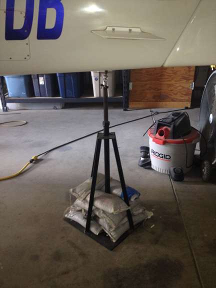 Also attached photo of my idea for rear stand. Welded from steel. I used a standard 1/2 inch socket universal for the rotation point, with a bolt welded on the top which screws into the airplane tie down. I use lead shot (available from the local shot gun reloading outlet) for weight.