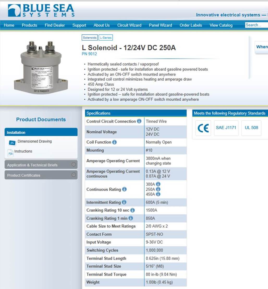 With all the discussion regarding contactors/relays for starters, battery masters, and hydraulic pumps, we’ve been planning on using this Blue Sea contactor for the battery master and starter (http://www.bluesea.com/products/9012/L_Solenoid_-_12_24V_DC_250A ). Now thinking about using it for the hydraulic pump. It was recommended a few years ago by someone on the LML and looks very capable. We already have several of them and they look very well made – targeted toward marine applications though on the outside it looks like aerospace quality. Still planning on diode snubbers. Fairly heavy though at 1 lb each.