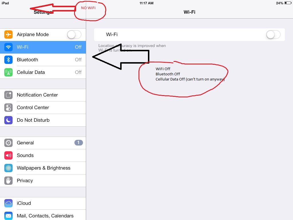 The first shot is of the Settings page on the iPad.  No Wifi, No Bluetooth and I assure you nothing is connected to the iPad.